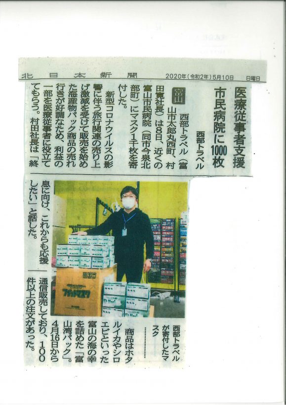 北日本新聞2020年5月10日「医療従事者へマスク寄付」