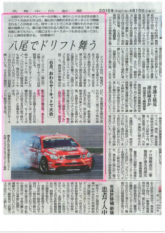 富山新聞 2015年4月30日 県内初ドリフト競技会