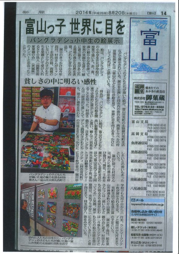 富山新聞 2014年8月20日 バングラディッシュ小中生の絵展示