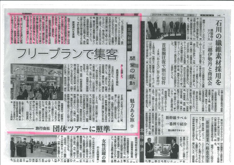 富山新聞 2015年1月22日 北陸新幹線団体ツアー