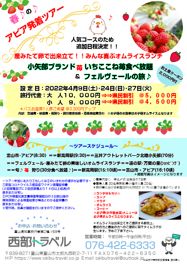 小矢部ブランド”いちここね”イチゴ食べ放題&うみたて卵のオムライス「フェルヴェール」の旅♪