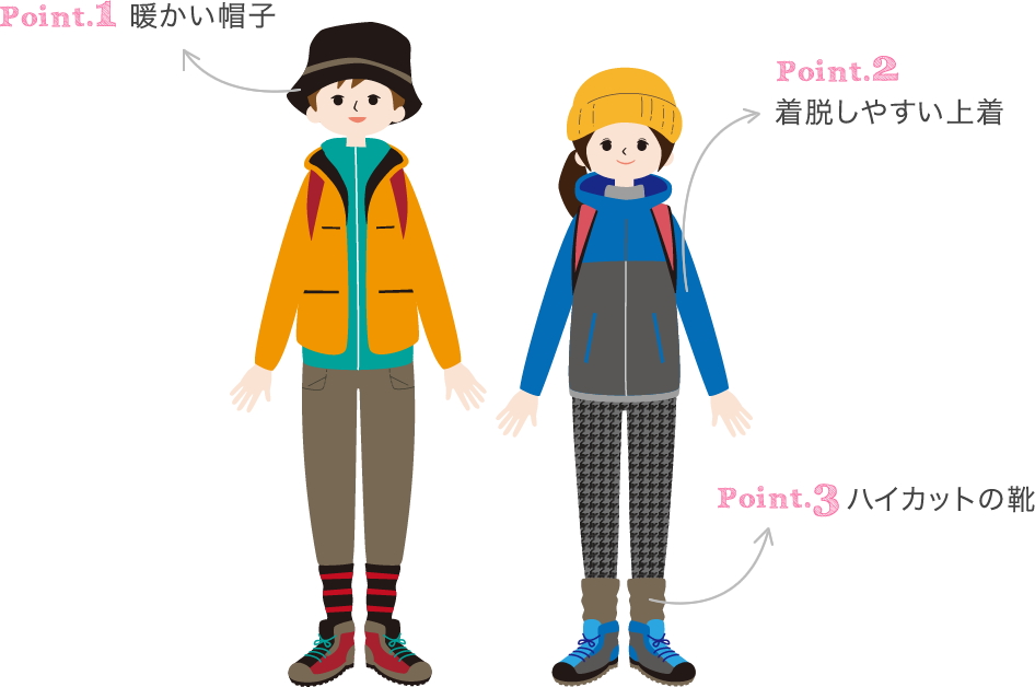 - 気温が最高でも10℃以下です。真冬の服装をご準備ください。